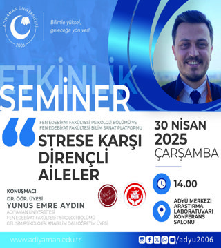Sosyolojik Saha Araştırmalarıyla Deprem Sonrası Adıyaman16Nisan2025 10:00ADYÜ Mustafa V. KOÇ KONFERANS SALONUStrese Karşı Dirençli Aileler30Nisan2025 14:00ADYÜ Merkezi Araştırma Laboratuvarı Konferans Salonu